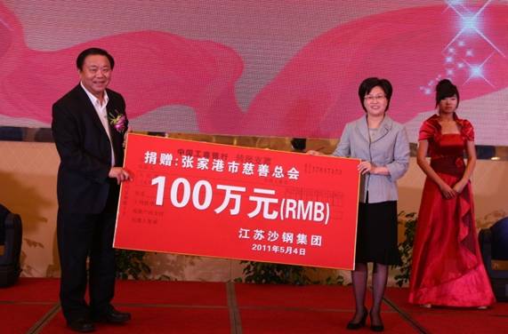 2003年“非典”期間,向淮安市政府捐贈10萬元。向淮安市慈善基金會捐款35萬元用于慈善事業。向淮安市慈善總會捐款100萬元,用于關愛困難職工和外來務工人員。2010年,沙鋼集團安陽永興公司向河南省安陽縣水治鎮區殘疾人捐款6萬元。