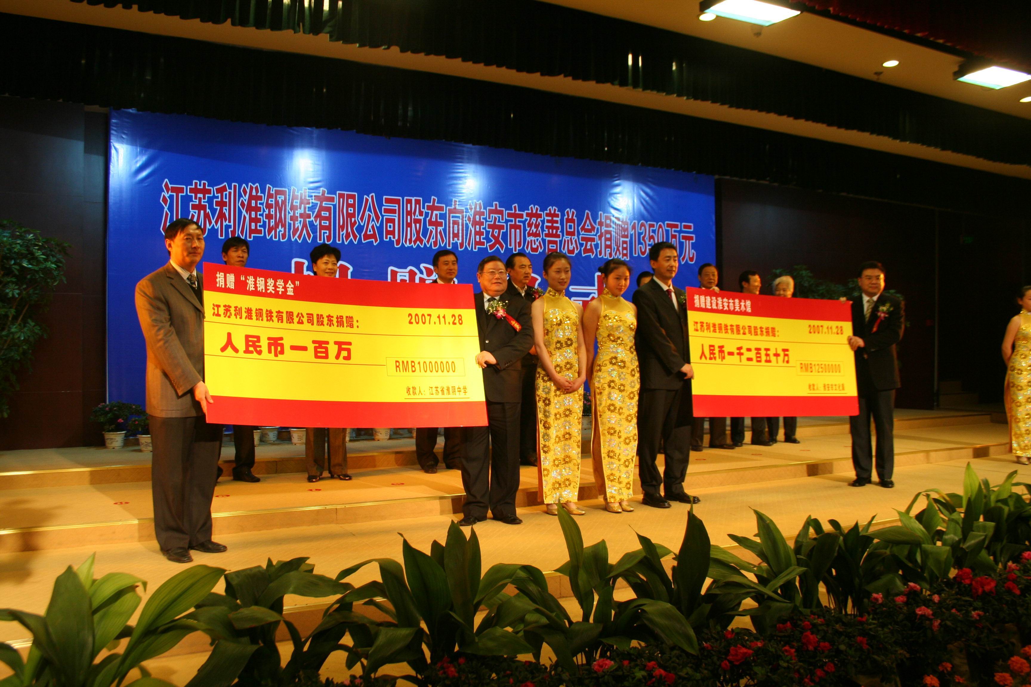 2002年,沙鋼淮鋼特鋼公司在淮陰區五里小學成立“淮鋼春蕾班”,每年資助1.5萬元;2007年向淮安市慈善總會捐贈1350萬元,其中1250萬元由市慈善總會定向捐贈淮安市利淮“美術館”,另100萬元贈給江蘇省淮陰中學作為“淮鋼獎學金”;向淮安團市委希望辦捐款以及向淮安盱眙穆店 鄉中心小學捐贈“愛心禮盒”等捐款累計112萬元。